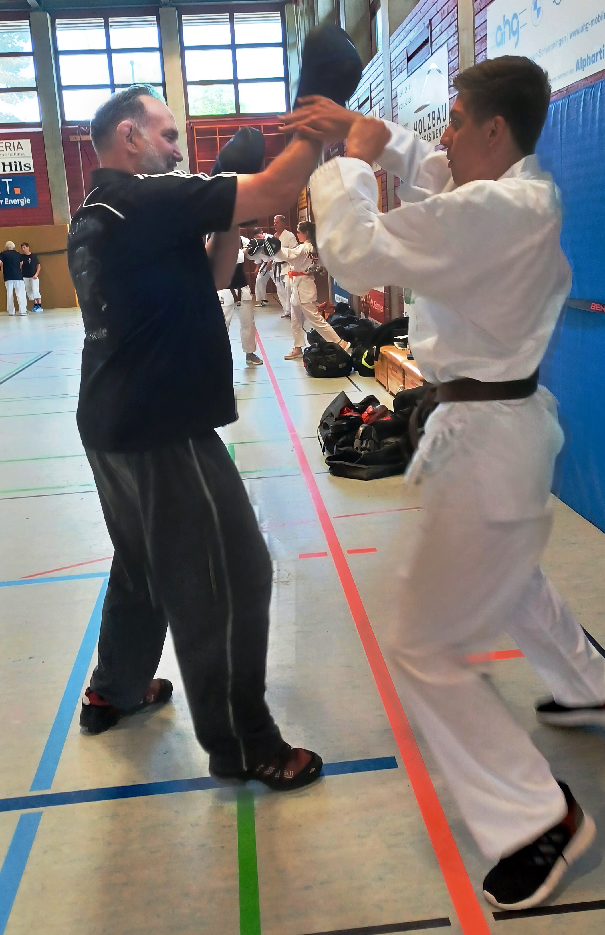 Lehrgangsthema waren Abwehr- und Kontertechniken mit dem Fokus der richtigen Positionierung und immer in Bewegung zu bleiben. Befreiung von Festhaltegriffen, auch im engen Bereich, z.B. an einer Wand, stellten einen weiteren Schwerpunkt dar.  Ebenso stand das Reaktions- und Reflextraining bei Angriffen mit gefährlichen Gegenständen im Mittelpunkt. Beim Pratzentraining konnte jeder die Effektivität der Techniken spüren. Zum Schluss wurde alles nochmals in ein Stresstraining verpackt, in dem das Geübte und neu Erlernte nochmals trainiert wurde.