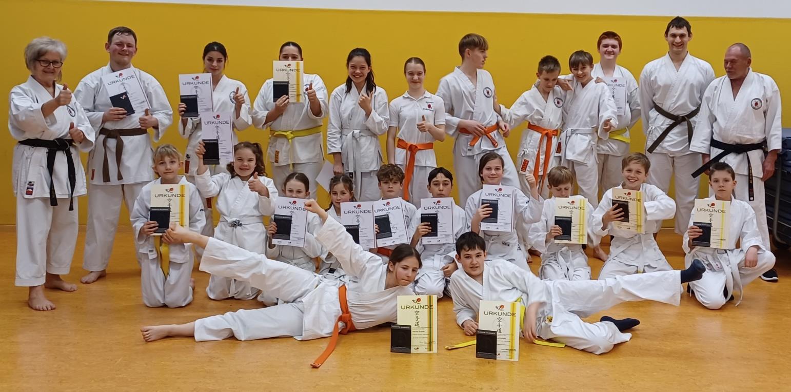 Etliche Kinder und Jugendliche der Budogruppe freuten sich vor Ostern über die bestandene. An 3 Tagen fanden in der Budogruppe Prüfungen statt an denen 35 Vereinsmitglieder teilnahmen. Vor allen die Kinder fieberten erwartungsvoll der Prüfung entgegen. Geprüft wurde die Grundschule, in der die elementaren Techniken des Karates gezeigt werden.
